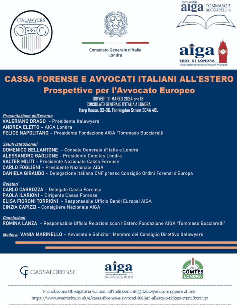 Si svolgerà Giovedi 21 Marzo 2024 dalle ore 18, presso il Consolato Generale d’Italia di Londra il convegno “Cassa Forense e Avvocati Italiani all’Estero – Prospettive per l’Avvocato Europeo”