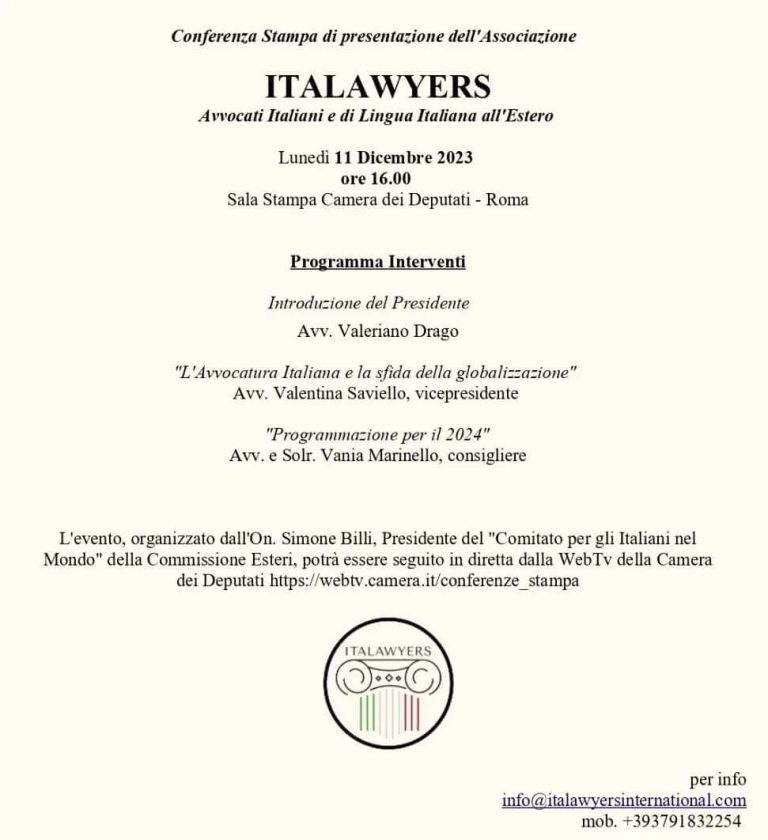 Lunedi 11 Dicembre 2023 alle ore 16, a Roma, presso la Sala Stampa della Camera dei Deputati, verrà presentata la nostra Associazione, una realtà attiva nel contesto internazionale da oltre tre anni e che comprende avvocati italiani o di lingua italiana presenti in oltre 20 nazioni nel mondo.